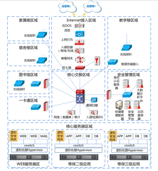 本方案為延安職業(yè)技術(shù)學(xué)院提供校園網(wǎng)綜合安全防護(hù)解決方案,包括互聯(lián)網(wǎng)接入安全防護(hù)、校園無線網(wǎng)安全防護(hù)、校園一卡通安全防護(hù)、校園蠕蟲病毒安全防護(hù)、校園云數(shù)據(jù)中心安全防護(hù)、校園大數(shù)據(jù)分析與安全管理、校園網(wǎng)基于等級(jí)保護(hù)的合規(guī)建設(shè)等,安全域劃分清晰,安全控制措施全面、適度,方便學(xué)校根據(jù)實(shí)際情況進(jìn)行校園網(wǎng)安全規(guī)劃與建設(shè)整改。通過該方案的建設(shè)與實(shí)施,從業(yè)務(wù)上保障校園教學(xué)、科研任務(wù)的進(jìn)行,逐步實(shí)現(xiàn)智慧校園的建設(shè)目標(biāo),同時(shí)也滿足等級(jí)保護(hù)相關(guān)合規(guī)要求。