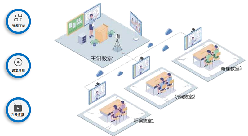 各課室建設錄播主機,實現(xiàn)課堂師生畫面跟蹤,音視頻錄制、在線直播、點播。系統(tǒng)實現(xiàn)在授課過程中,本地教室與遠程聽課教室之間的同步授課,以及實時音視頻互動交流;诱n程能夠同步錄制,真實展現(xiàn)互動教學場景。積極推動“一校帶多點”、“一校帶多校”的教學和教研組織模式,逐步使依托信息技術的“優(yōu)質學校帶薄弱學校、優(yōu)秀教師帶普通教室”模式制度化。