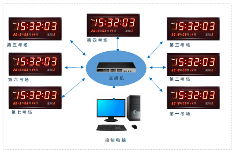在學校考場設計LED電子鐘,讓考生能時刻了解考試時間的進度,把握好自己答題的節(jié)奏,考出自己應有的水平,同時學校考場電子鐘能通過軟件統(tǒng)一對所有考場的電子鐘校時,保證所有考生都在同一時間開始和結束考試,體現(xiàn)學校教學的嚴謹和保證考試的公平公正。